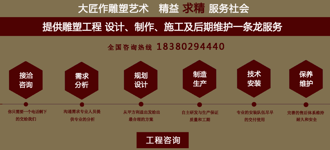 成都大匠作雕塑有限公司,是經(jīng)成都工商局審定注冊的正規(guī)專業(yè)雕塑制作及工程安裝服務(wù)機構(gòu),是由一群年輕富有朝氣的年輕人創(chuàng)辦,發(fā)軔于四川省成都市龍泉驛區(qū)。它是一家******于創(chuàng)作、制作和銷售為一體的公司。大匠作擁有多年從事公共藝術(shù)的專業(yè)人員和雕塑制作人組成的核心團隊,為您提供專業(yè)、具創(chuàng)新的設(shè)計及制作服務(wù)。公司成立以來,秉承“******服務(wù)、誠信為本”的宗旨,以客戶需求為目標(biāo)導(dǎo)向,不斷學(xué)習(xí),進(jìn)取,優(yōu)化和提高服務(wù)質(zhì)量,公司向您******——“您的滿意***是我們的信譽”,我們將以飽滿的熱情和******的服務(wù)贏得您的贊譽和支持。 愛心,細(xì)心,耐心,責(zé)任心是我們的要求,盡心盡職,為您打造出創(chuàng)新、專業(yè)、******的設(shè)計方案,我們堅信先做人、后做事,用心對待客戶,實行透明收費,人性化服務(wù),本著對客戶負(fù)責(zé),對客戶負(fù)責(zé),更是對自己發(fā)展負(fù)責(zé)的態(tài)度,爭取做到讓每位客戶滿意